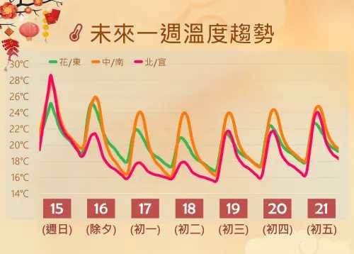 ▲除夕東北季風影響,早晚低溫變化不大,但白天高溫有明顯下滑。(圖/中央氣象署cwa.gov.tw)