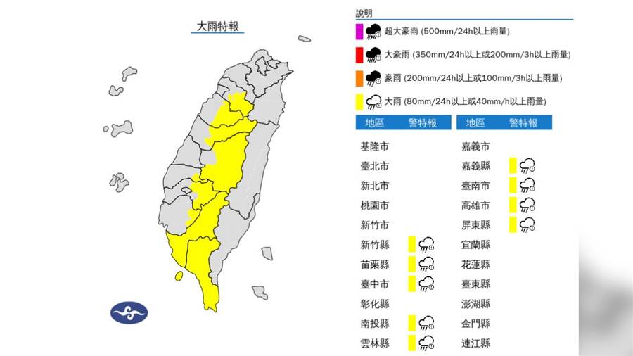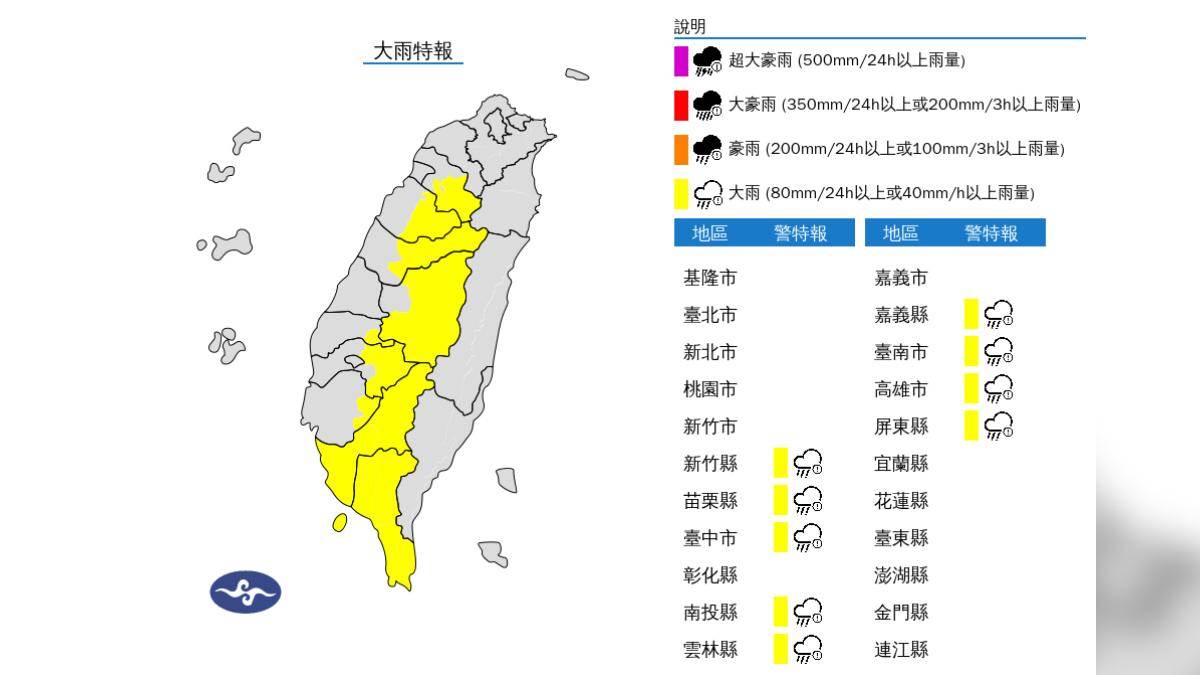 今(17)天受到對流旺盛影響,氣象署于下午3點10分發布大雨特報,影響時間從今日下午至晚上,大雨縣市為新竹縣山區、苗栗縣山區、臺中市山區、南投縣山區、雲林縣山區、嘉義縣山區、臺南市山區、高雄市、屏東縣、恆春半島。氣象署提醒,午後對流雲系發展旺盛,易有短延時強降雨,今日高雄、屏東地區及新竹至臺南山區有局部大雨發生的機率,請注意雷擊及強陣風,山區請慎防坍方、落石及溪水暴漲。