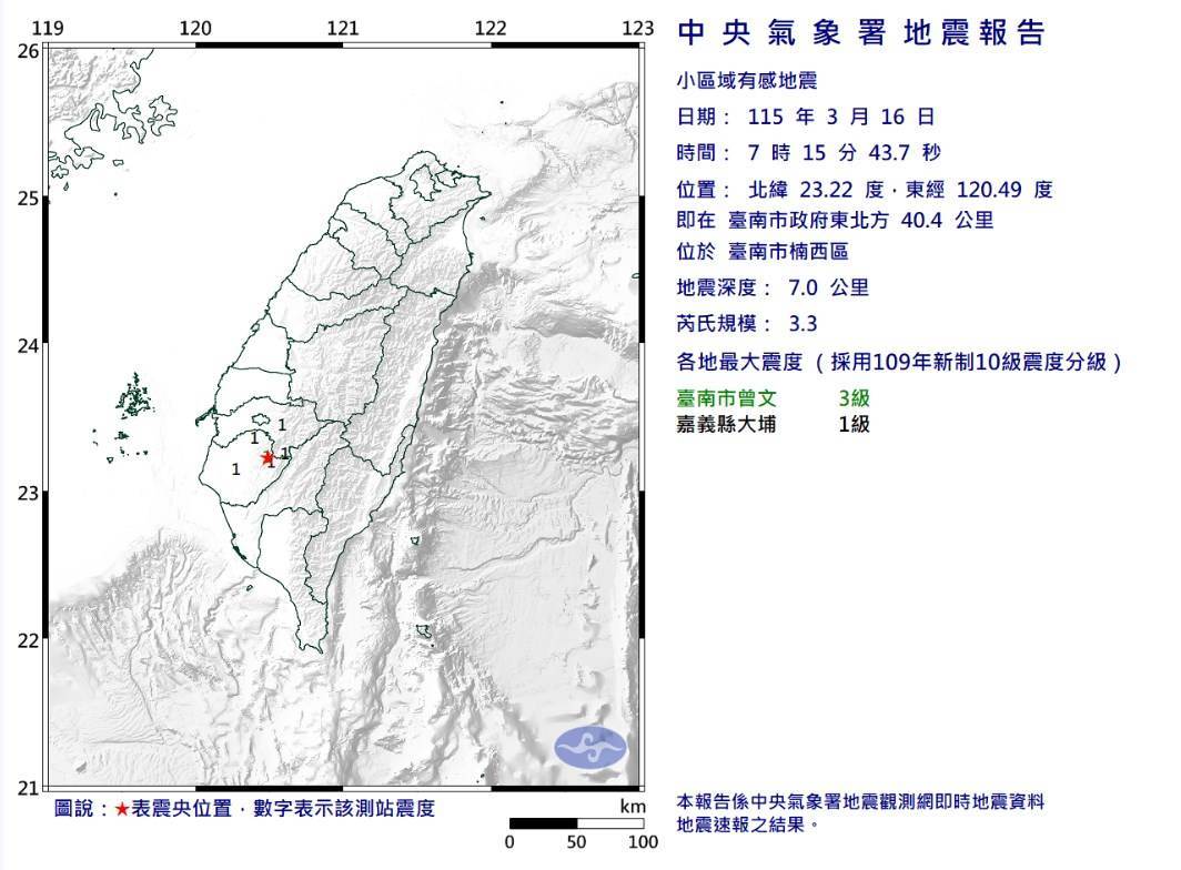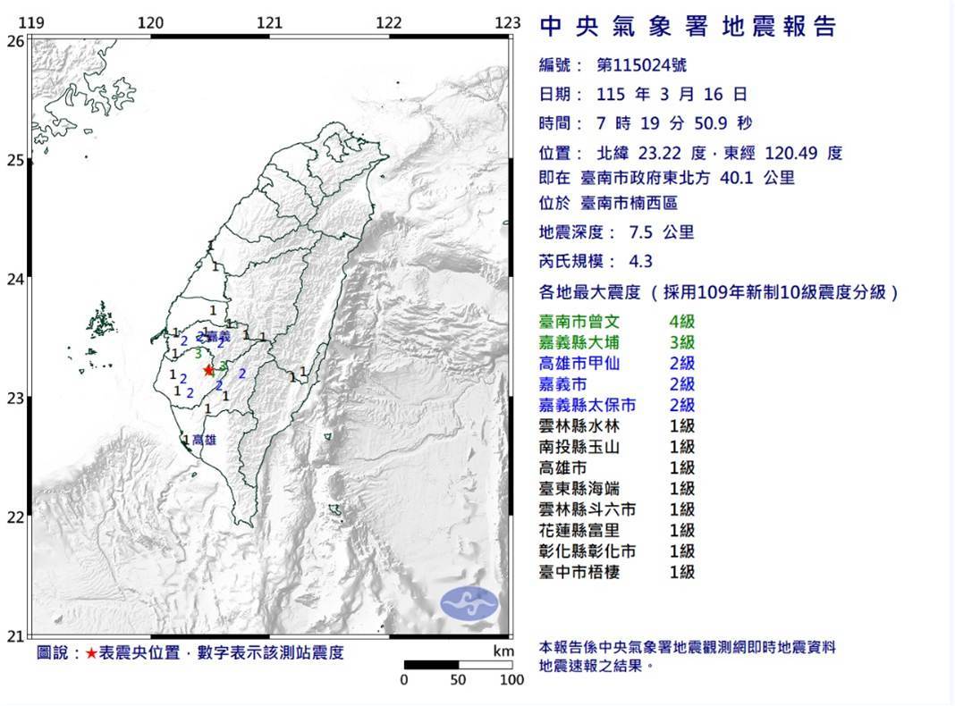 今(16日)早上7時15分,臺南市楠西區發生芮氏規模3.3地震,地震深度僅7公里,臺南市地區最大震度 3級、嘉義縣地區最大震度1級。稍早,7時19分臺南楠西區又發生一起芮氏規模4.3地震,地震深度7.5公里,臺南市地區最大震度4級。