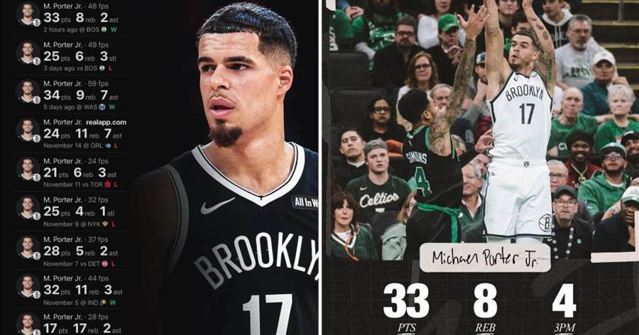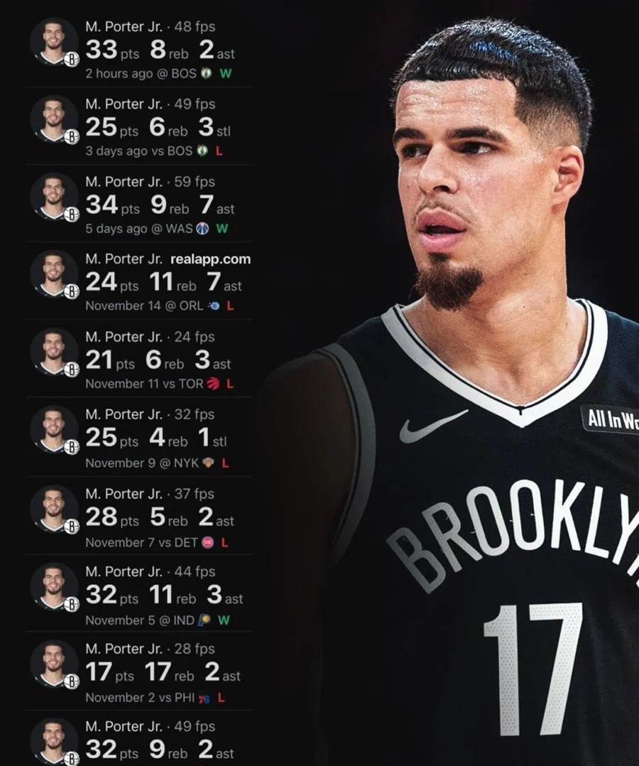 自从离开掘金,很少看到小迈克尔-波特的新闻。其实他最近打得不错,过去8场比赛,小波特在篮网场均砍下27.8分7.5篮板3.3助攻,投篮命中率50.3%,三分命中率40.6%。赛季至今,小波特打了14场比赛,其中5场砍下30+!