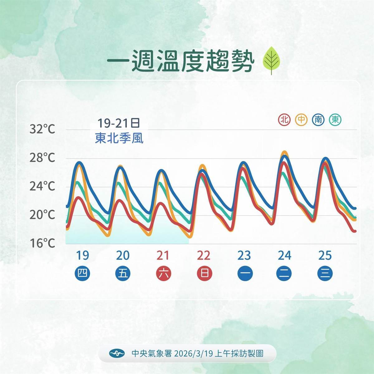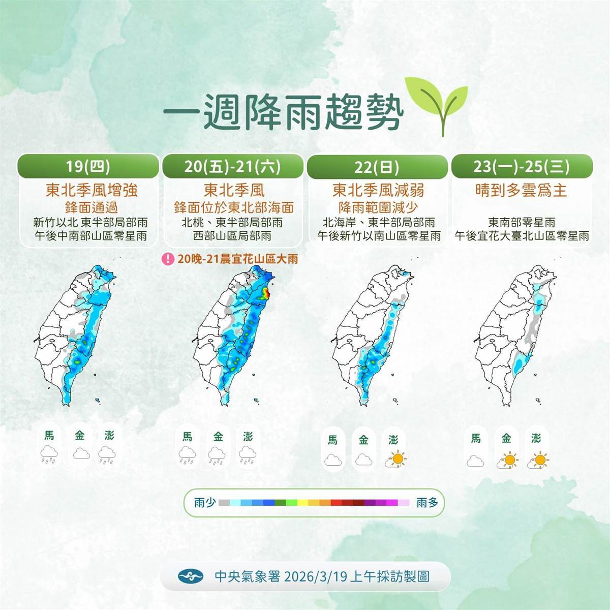 吳德榮在「氣象應用推廣基金會」專欄提到,最新(19日20時)歐洲模式(ECMWF)模擬顯示,今、明(20、21日)兩天東北風影響、迎風面北海岸、東半部偶有區域性短暫雨,東北部有較大雨勢;北臺偏涼,中南部白天微熱、早晚涼。今日各地區氣溫如下:北部15至24度、中部16至30度、南部16至32度、東部17至29度。