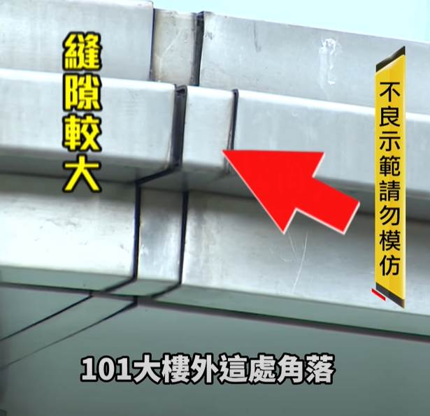 遠看不覺得有異狀,但近看建築鐵框接縫處,明顯比旁邊都還要寬許多,就怕再有其他人模仿,101大樓外這處角落,也圍起封鎖線,要大家切勿攀爬。