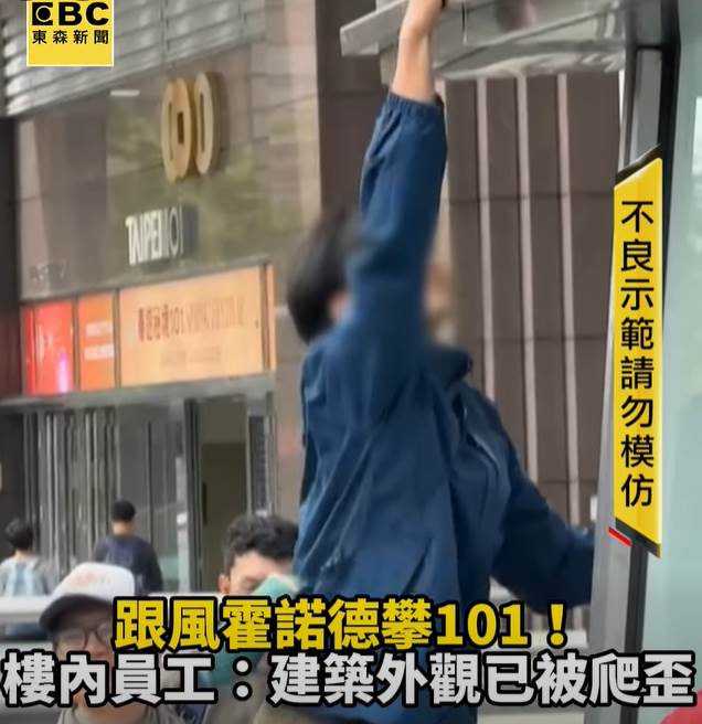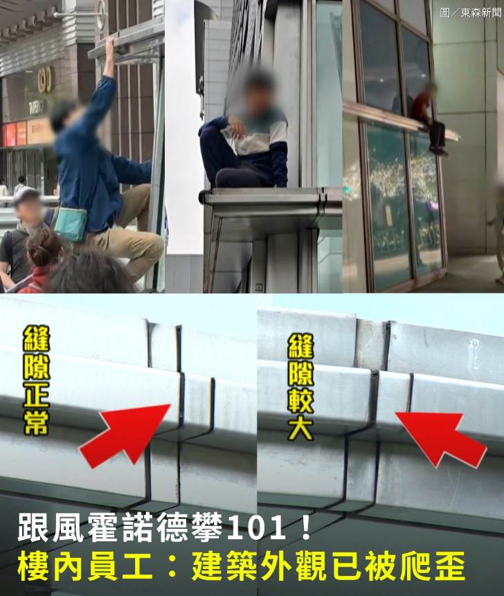 好多民眾跟風模仿霍諾德,導致101外牆結構已經歪了。(圖/東森新聞)