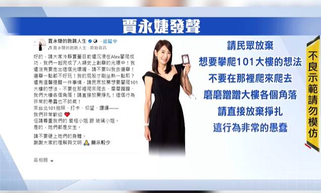 倒是董事長賈永婕早就發文提醒,請民眾放棄想要攀爬101大樓的想法,不要在那裡爬來爬去、磨磨蹭蹭大樓各個角落,請直接放棄掙扎,這行為非常地愚蠢。