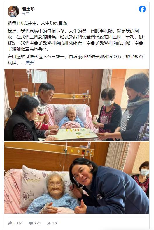 陳玉珍驚傳其摯愛過世!她4日在臉書發文,透露祖母林淑女女士安詳辭世,享嵩壽110歲,並在文中追憶阿嬤的傳奇人生,字裡行間滿是不捨與感恩。陳玉珍祖母靈堂已設置于金門縣殯儀館四維堂,公祭儀式訂于2月14日中午12時舉行,守喪期間所有活動將暫停參與。
