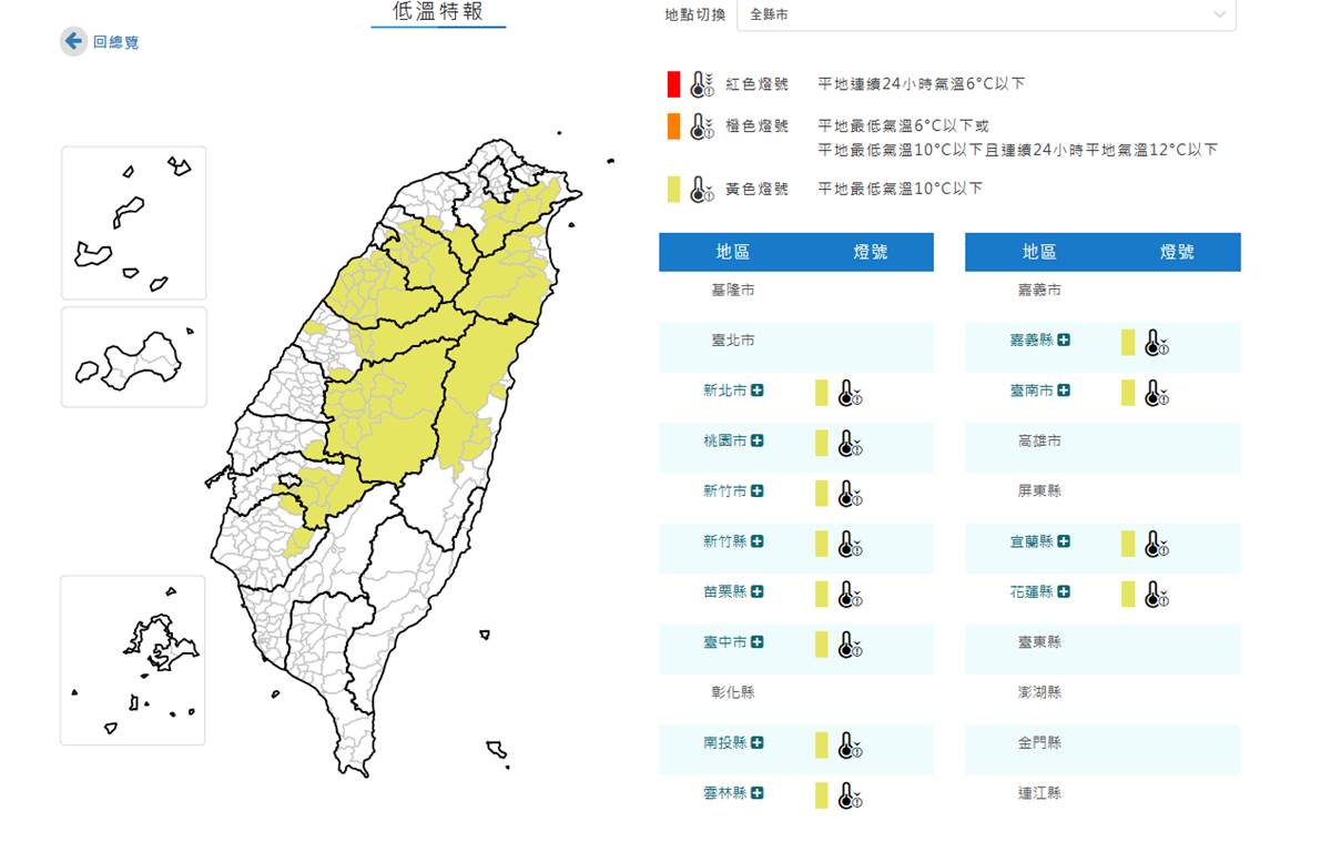 【黃色燈號(寒冷)】新北市、桃園市、新竹市、新竹縣、苗栗縣、臺中市、南投縣、雲林縣、嘉義縣、臺南市、宜蘭縣、花蓮縣有10度以下氣溫發生的機率,請注意。