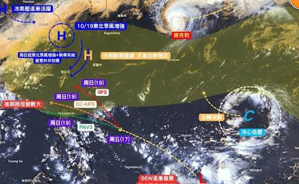「台灣颱風論壇|天氣特急」指出,熱帶擾動96W還在組織性改善中,預計要2至3天才有機會增強為風神颱風。路徑方面,會先朝菲律賓呂宋島移動,之後遇到槽線東移、高壓減弱,可能短暫北偏進入巴士海峽,隨後東北季風持續增強、颱風減弱,而往西南移動。