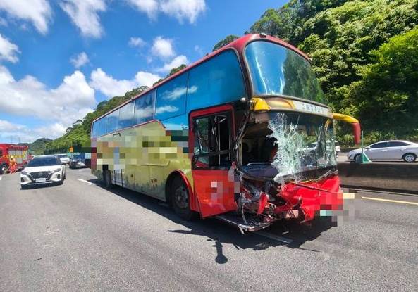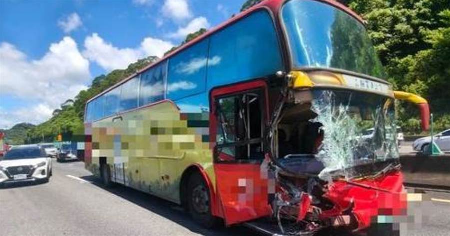 警方說明,江男自述因未注意前方車流回堵的末端,發現時已來不及煞車,先衝撞前方第1輛轎車後,轎車再往前推撞3輛車,總計1大4小車連環撞,事故占用外線車道,其中遊覽車右前車頭當場撞破一個洞,第1輛首當其衝的轎車車體也嚴重爛毀。