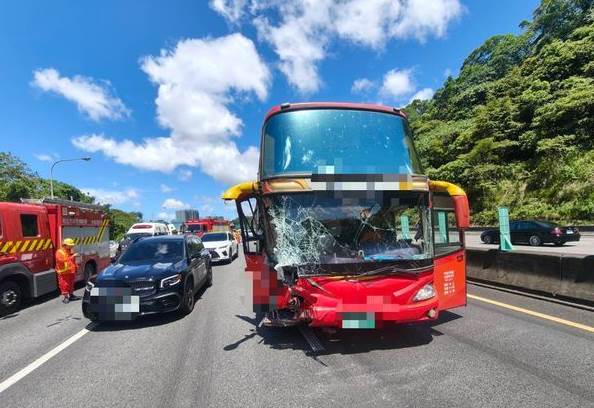 ▲國3汐止段遊覽車因未注意前方回堵,造成5車連環撞,7人受傷送醫。(圖/記者陸運陞翻攝,下同)
