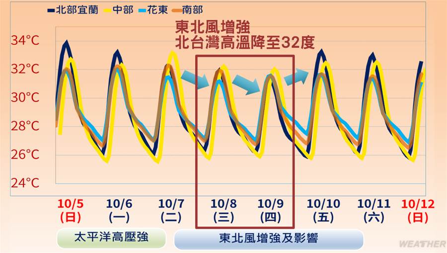 氣象署表示,明(7)東北風增強,基隆北海岸、東北部、大台北山區及恆春半島有局部短暫陣雨,東部及東南部地區有零星短暫陣雨,午後中南部局部短暫雷陣雨。