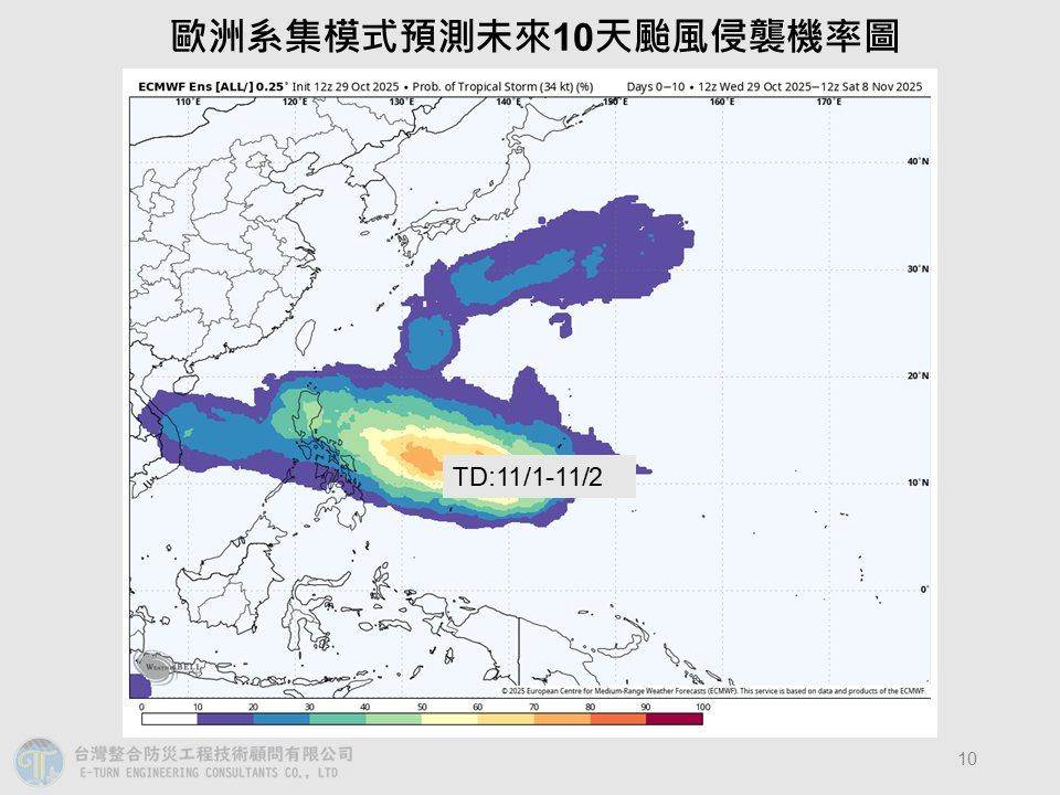 歐洲系集模式預測未來十天颱風侵襲機率圖。(圖/翻攝自賈新興臉書)