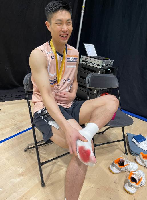 2024年北極羽球公開賽男單決賽場上,台灣羽球一哥周天成左腳底早已磨破的水泡不斷滲血,每移動一步都伴隨著刺骨的疼痛,但他依然全力衝刺、跳殺、撲救,與泰國名將昆拉武特鏖戰三局,最終以2比1艱難取勝,完成賽史罕見的「二連霸」。