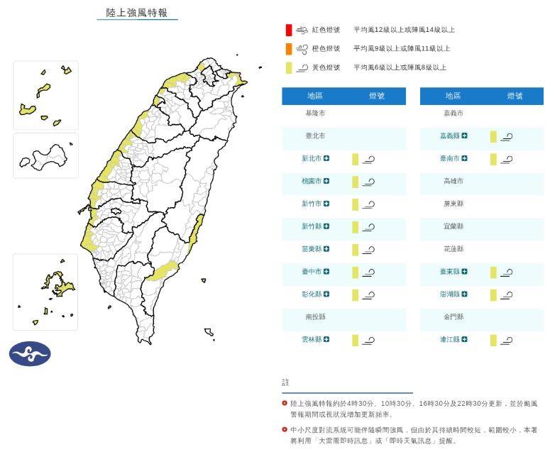 受到東北風增強影響,交通部中央氣象署于15日晚間10時許發布陸上強風特報,預計在16日白天至晚間。(圖/氣象署)