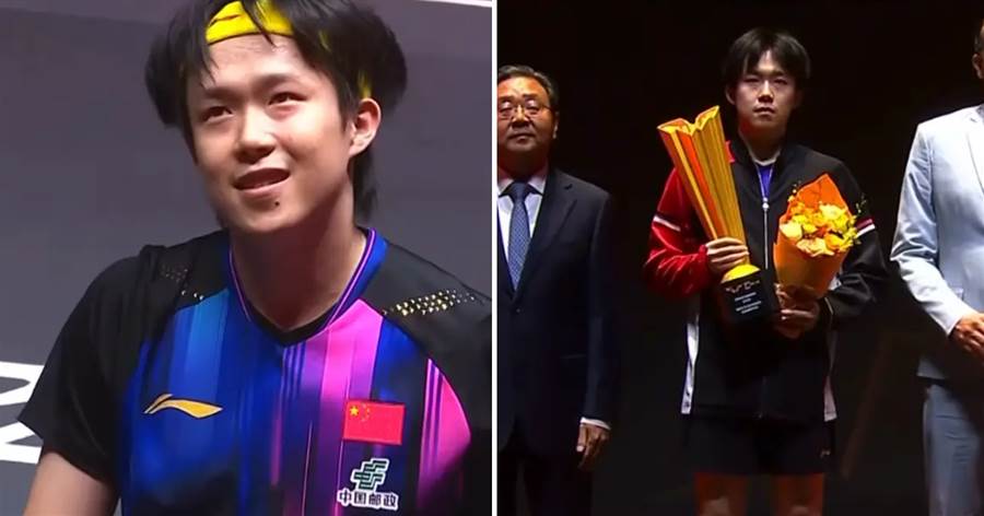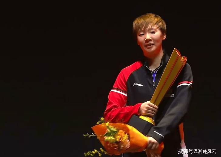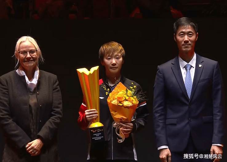 國際乒聯主席佩特拉.索林給曼昱頒發獎杯。乒壇兩位大佬一起跟曼昱合影。曼昱露出了微微的笑容。