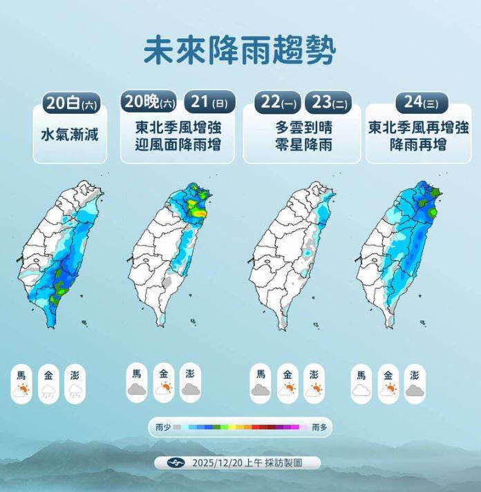 氣象署指出,下週三東北季風再度增強,這波比21日的持續更久,強度更高,可能持續到下週六。下週三、週四(25日)兩天,水氣再增多,北部、東半部地區、恆春半島有局部短暫雨,中南部山區也出現了零星短暫雨。