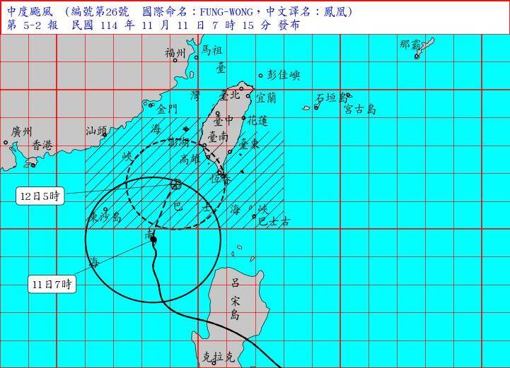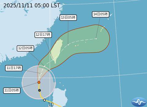 10日深夜23時的預報,登陸點已經往南調整到高雄一帶沿海,暴風圈接觸南部沿岸的時間提早到週三(12日)凌晨開始,中心登陸的時間也逐漸提早到週三的傍晚之前,說不定週三下午就會登陸了。