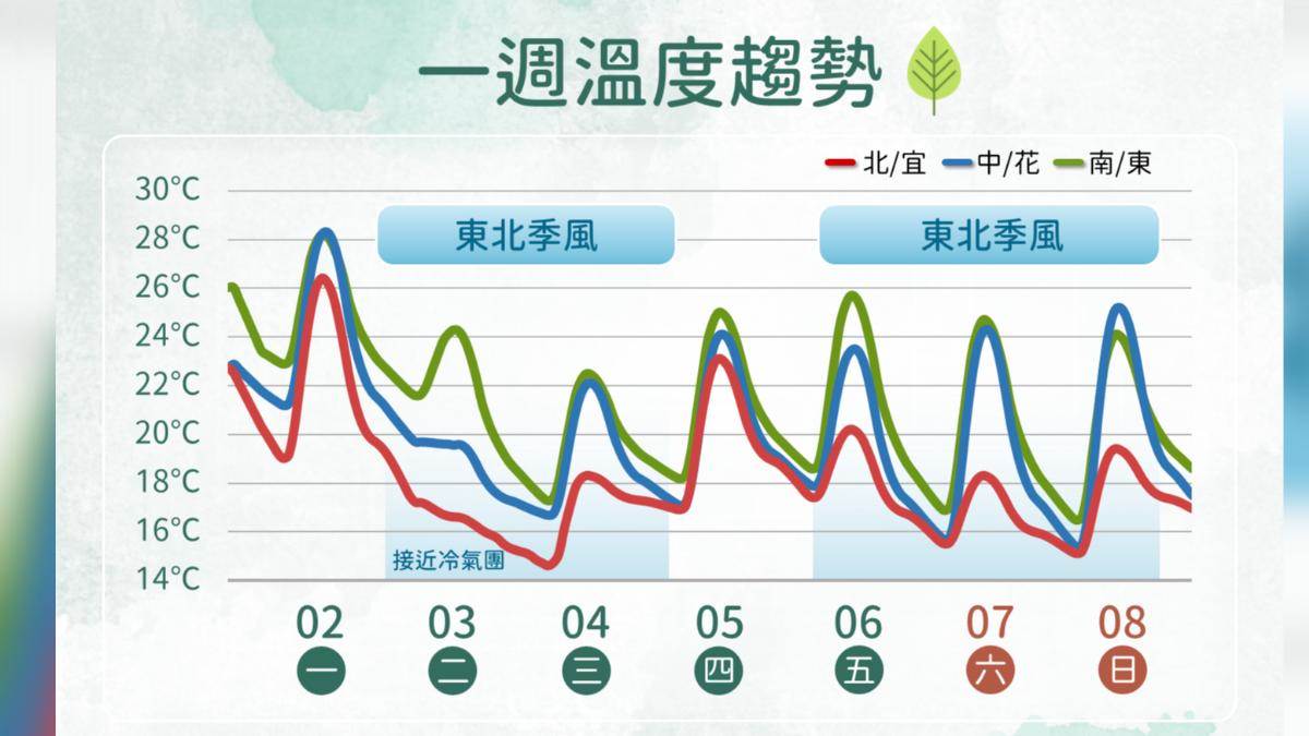 溫度部分,謝佩蕓指出,今天算是未來一週最暖的一天,今天預計北部、東北部、東部地區白天高溫可以到26、27度,中南部、臺東地區高溫可以到29-31度。明天隨著東北季風增強,涼冷空氣南下、各地降溫,尤其北台灣降溫幅度非常大,預計這股冷空氣介于東北季風,甚至是冷氣團等級,北台灣低溫可能只有14、15度,預計這波冷空氣影響的時間會至週三、週四後,週四氣溫回升,週五又有東北季風南下,北台灣的溫度又會再度下降。