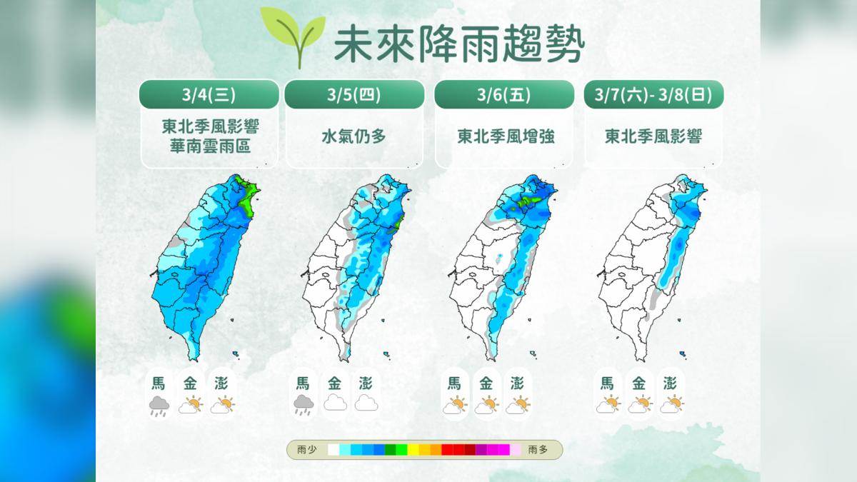 中央氣象署預報員謝佩蕓說明,台灣附近今天有一道鋒面正逐漸透過,不過今天上午台灣上空雲層比較少,很多地方屬于多雲到晴天氣,白天降雨相對較少,北部、東半部、東南部山區要注意零星陣雨,但台灣西側華南地區有非常多水氣,接下來會陸續透過台灣,今晚到明天隨著水氣增多,降雨狀況也會變比較多,西半部地區降雨逐漸往南移動,金門附近可能會有雷雨,各地降雨機率都明顯提高;週三水氣仍在台灣附近,但到週五水氣減少,不過東北季風增強,北台灣的降雨會再增多一些,東半部也會轉陣雨,週末迎風面注意降雨。