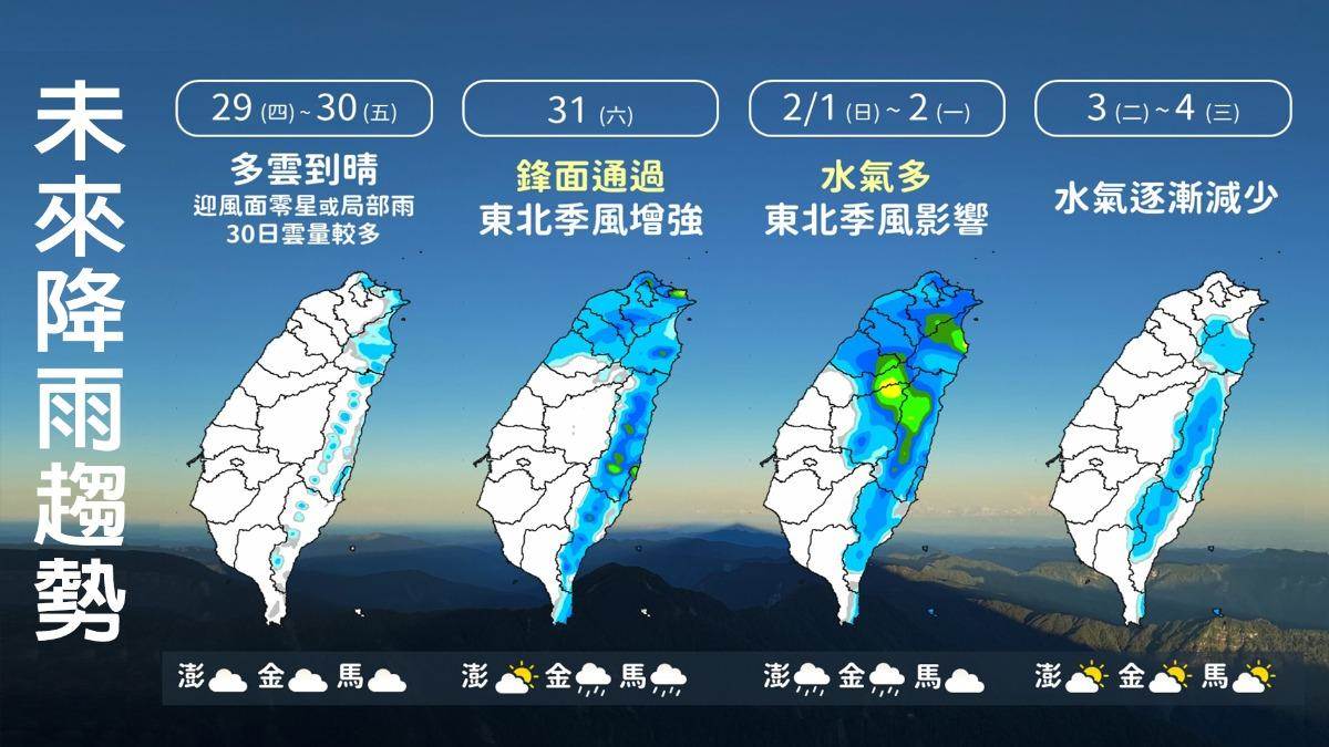 吳德榮續稱,週六下午起再一波強度類似的冷空氣南下,北部、東半部轉有局部雨;下週日至週二(1至3日)冷空氣影響,北台灣偏冷;下週日、一北部、東半部及中部局部地區有短暫雨,下週二北部雨後多雲、東半部有局部短暫雨。