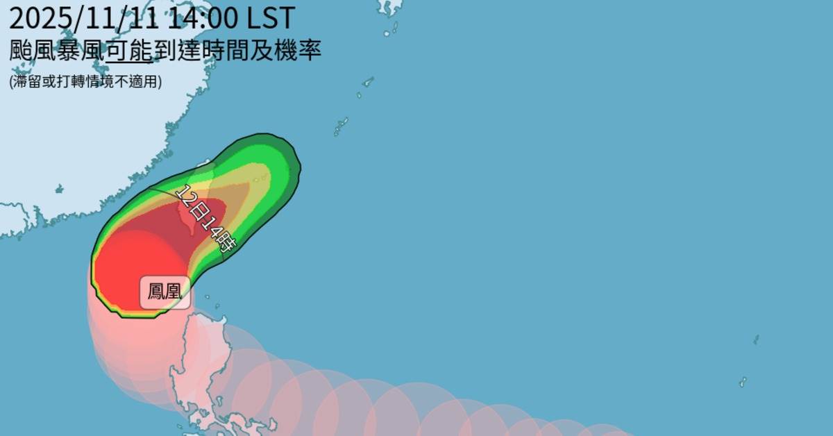 氣象署預估,週三(12日)、週四(13日)兩天是颱風及其外圍環流影響最劇烈的時間。12日颱風中心將逐漸接近西半部地區,屆時中南部、花東地區將有陣雨,並有大雨或區域性豪雨發生的機率,北部及東北部地區則為短暫陣雨。