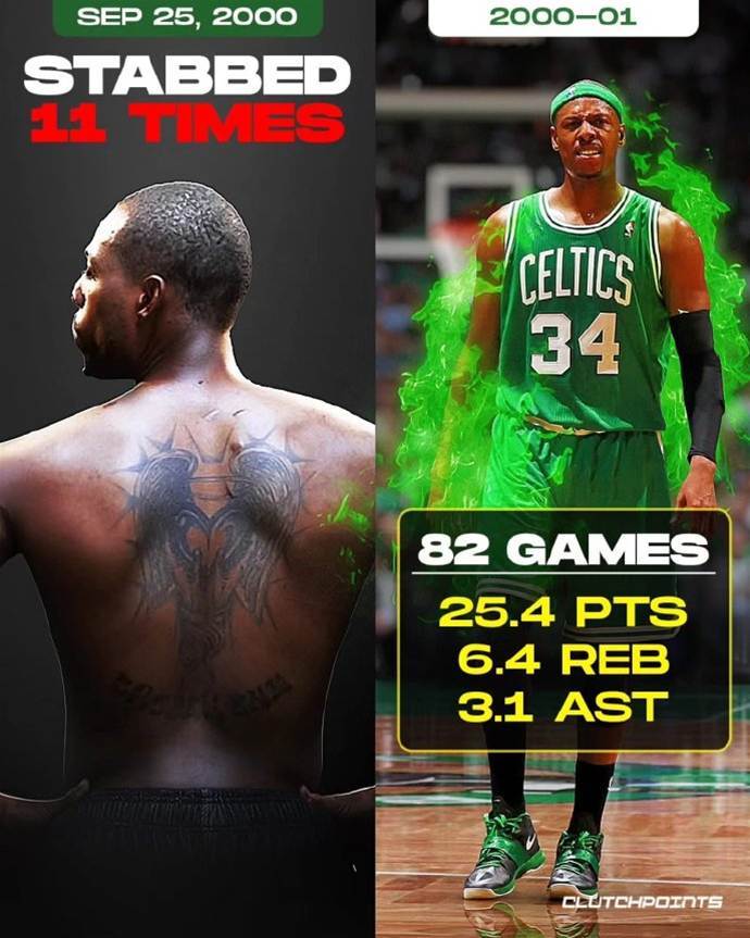被砍11刀的那個賽季,皮爾斯狀態不僅沒有下滑,還比前兩個賽季都要出色。在和湖人隊的比賽中大戰科比和奧尼爾的OK組合,皮爾斯全場19投13中以超高效率拿下42分。