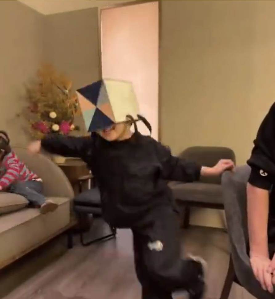 甚至將禮盒袋子套在了頭上,一頓亂蹦亂跳,也把全紅嬋逗得哈哈大笑。