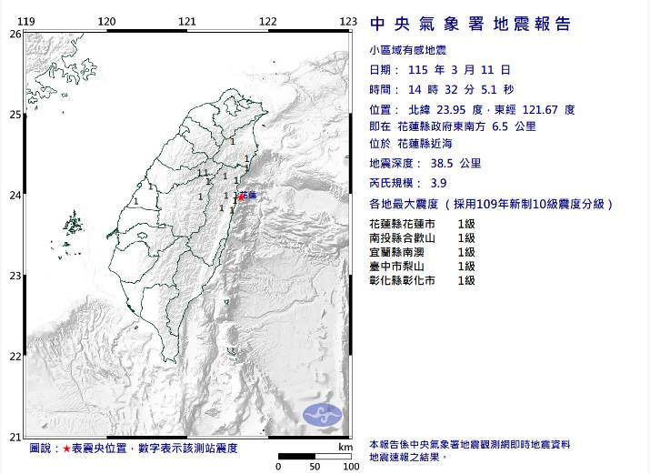 今(11)日下午2點32分,花蓮縣近海發生芮氏規模3.9的地震,震央位于花蓮縣政府東南方6.5公里處,震源深度為38.5公里,最大震度1級。