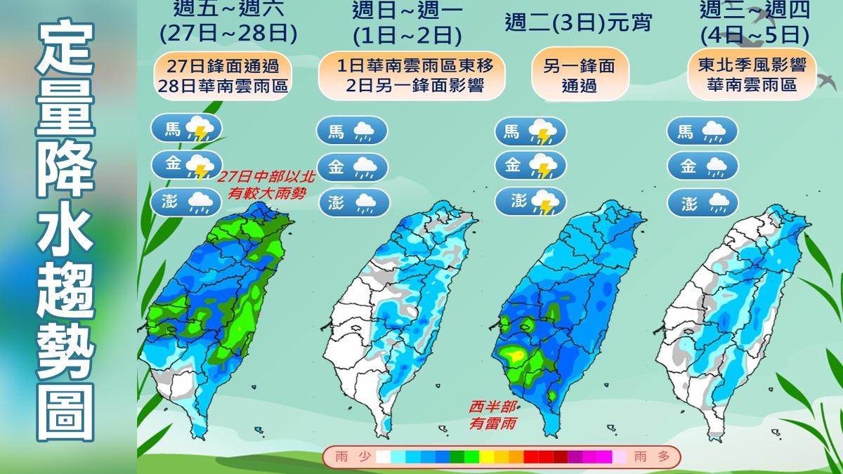 針對未來天氣,氣象署說,下週一(3/2)受到另一鋒面影響,北部及東北部地區有短暫陣雨,中部、東部、東南部地區及恆春半島有局部短暫陣雨,南部地區亦有零星短暫陣雨。氣象署預估,下週日(3/1)、下週一低溫預測,台灣各地及澎湖18至22度,金門14至16度,馬祖12至13度;高溫預測:台灣各地及澎湖25至31度,金門20至23度,馬祖16至18度。