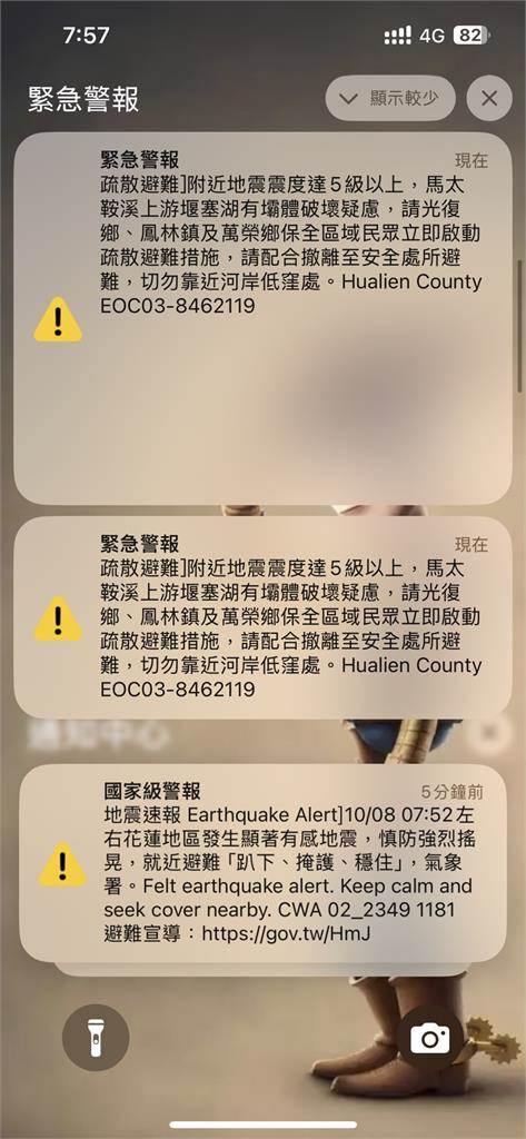 由于地震可能再次破壞馬太鞍溪上游的堰塞湖,造成再次潰堤,官方稍早發出緊急警報,要求光復鄉、鳳林鎮、萬榮鄉保全區域民眾「立即避難」,切勿靠近河岸!