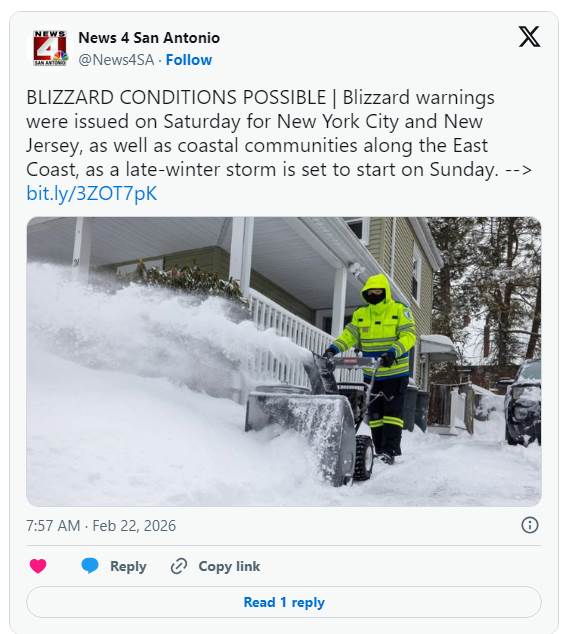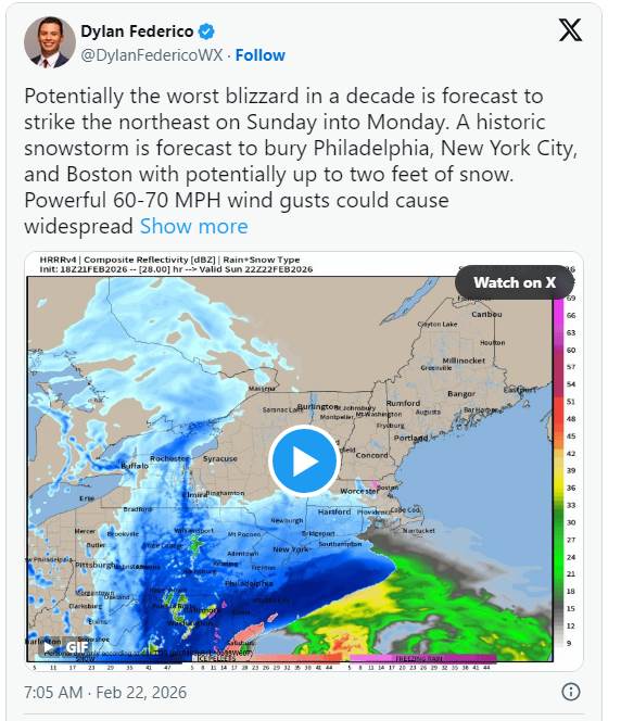 紐約政府宣布,暴風雪警報將自當地時間週日(22日)下午13時起生效,持續至週一下午18時。氣象預報指出,影響最劇時刻落在週日晚間至週一上午,南部地區降雪量可能達18至24英吋(約45.72至60.96公分),屆時可能出現強風吹雪,能見度趨近于零,並伴隨停電及樹木倒塌災情,外出恐有生命危險。