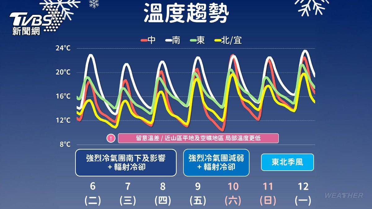 週二開始,強烈大陸冷氣團的威力就開始展現,北部、東部轉為多雲偏陰的天氣型態,局部地區還會出現地形性短暫降雨。溫度方面,中北部及東北部白天最高僅能來到15度,中南部雖稍暖和些,也只有19至24度;花東則落在19至22度之間。入夜後至隔日清晨,各地低溫將降至11至14度,西半部因輻射冷卻效應加持,部分區域甚至可能跌破10度大關。