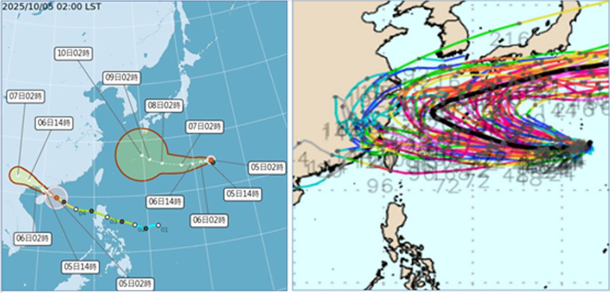 5日2時氣象署「路徑潛勢預測圖」顯示,「中颱麥德姆」,偏西北西、今日颱風中心通過雷州半島附近,暴風圈先後侵襲海南島、兩廣及越南北部(左圖)。4日20時歐洲系集模式模擬圖顯示,「哈隆颱風」系集平均路徑已調整在琉球東側向東北大迴轉;但由于個別模擬路徑很分散,仍有少部分模擬路徑靠得比較近(右圖),正如同左圖「哈隆颱風」的紅圈擴大。