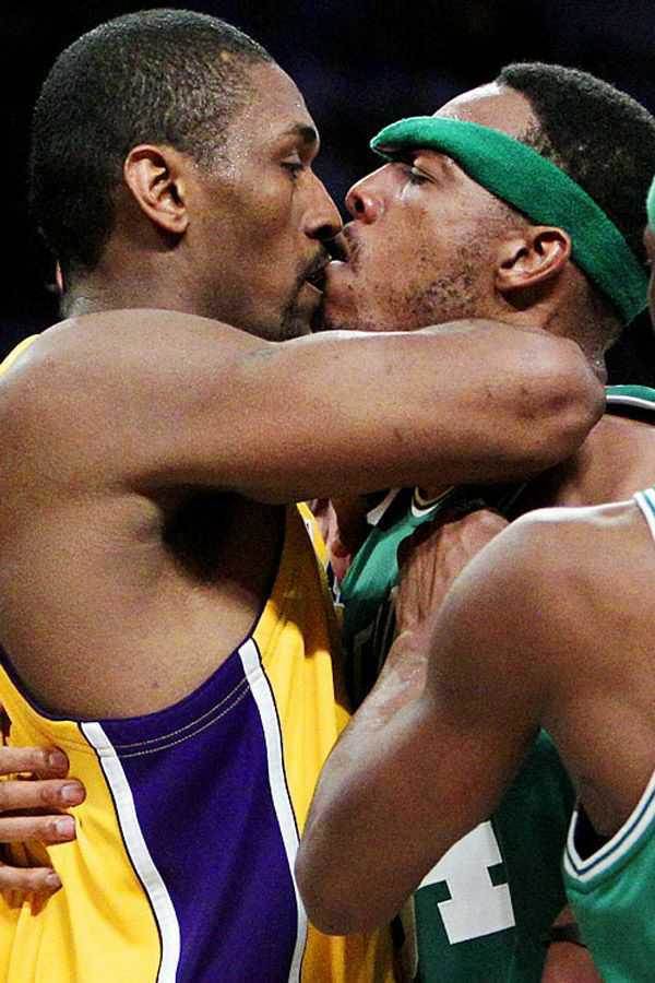 沒錯!又是阿泰和皮爾斯這對歡喜冤家。這次,換成了總決賽舞台,湖人和凱爾特人一向都是宿敵,而這一次,也不例外。作為球隊的防守箭頭,為了對付強大的老皮,阿泰也是想盡辦法要跟這個老朋友來點摩擦。這不,剛開場,兩個人就杠上了,阿泰可以說是咄咄逼人,竟然直接上嘴對付老皮,對此,老皮也是感到很受傷。阿泰真是太拼命了。