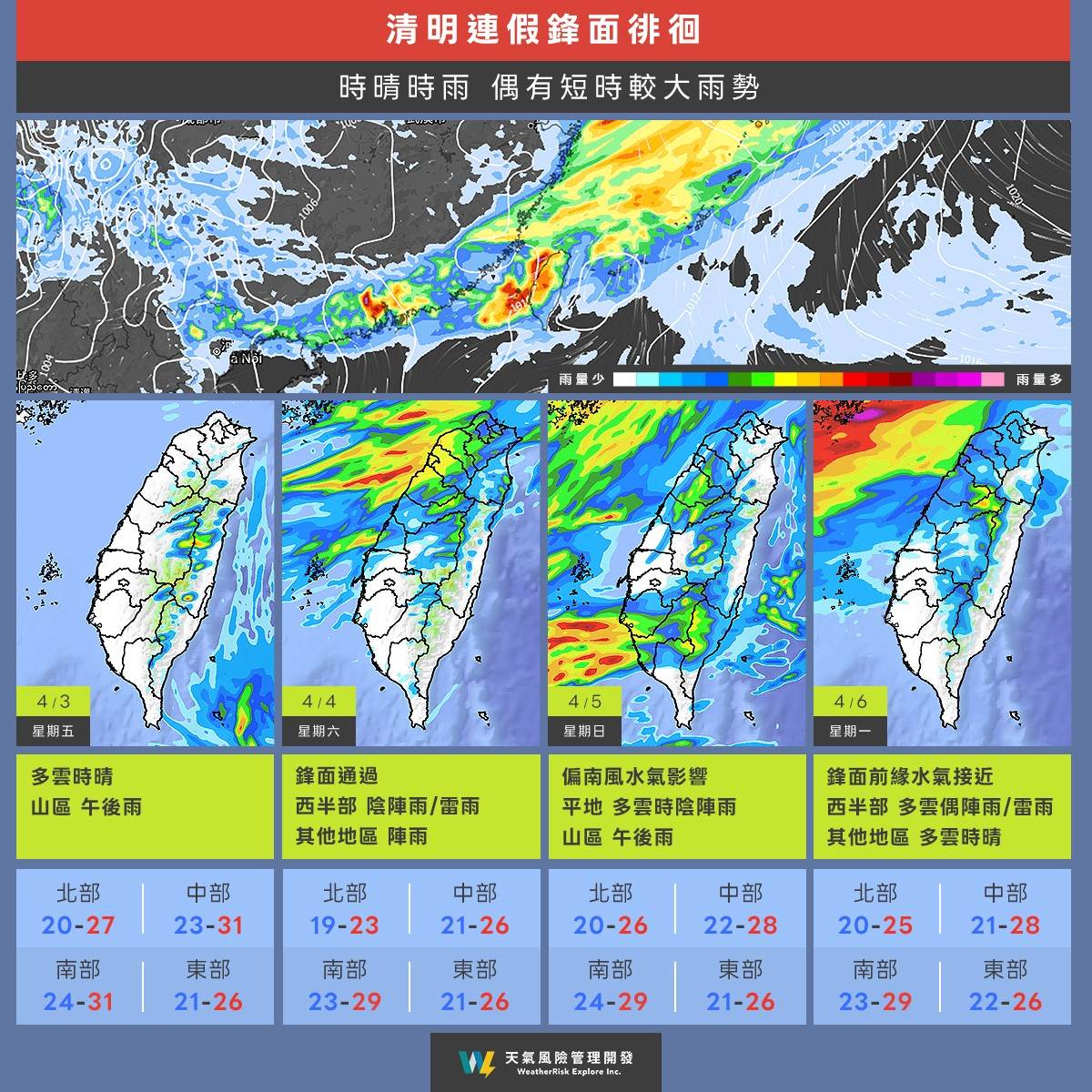 根據《自由時報》報導,氣象粉專「天氣風險 WeatherRisk」也在臉書分析清明連假4天天氣。
