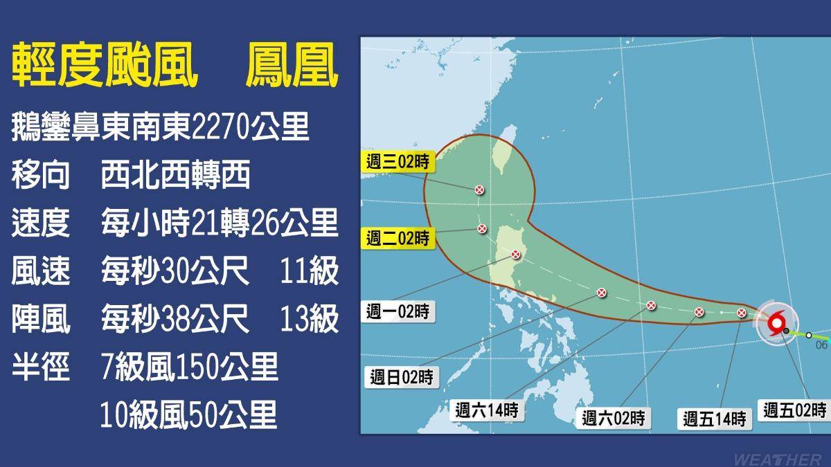 氣象署指出,輕度颱風鳳凰今日凌晨2時中心位于鵝鑾鼻東南東方2270公里的海面上,向西北西轉西前進,預測下週一會經過呂宋島並進入南海,有北轉的趨勢,下週一至下週三(12日)將影響台灣的天氣,屆時迎風面的北部、東半部雨勢將明顯增多,各地風浪亦增強,由于此颱風下週一後路徑不確定性較高,具體影響的程度及區域仍需視后續路徑而定。