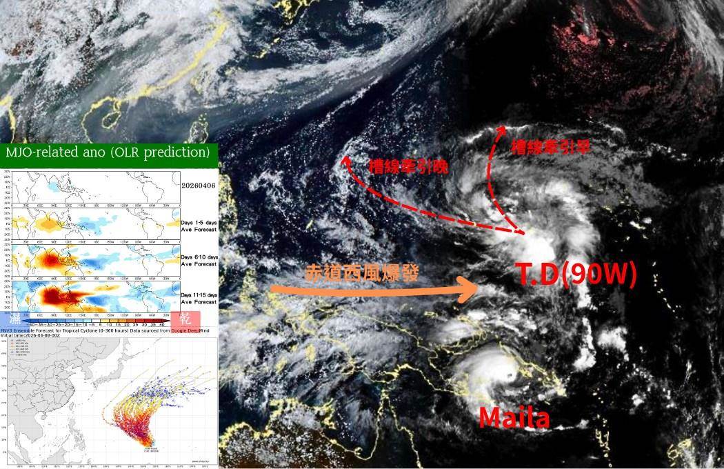 「觀氣象看天氣」指出,根據目前資料顯示,未來差不多2至3天內,MJO濕區將移入西北太平洋一帶,將有利熱帶低壓90W發展,根據AI模式預測,有機會在成為今年第4號颱風辛樂克,且強度可能達到中度颱風以上,環流也不會太小。