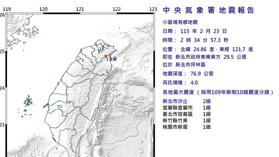 新北市坪林區今(23)日凌晨2時34分發生規模4.0地震,各地最大震度出爐,其中雙北、宜蘭地區最有感,汐止達2級、新店1級、淡水1級,宜蘭市1級、南澳1級、頭城1級,臺北市信義區則為1級。