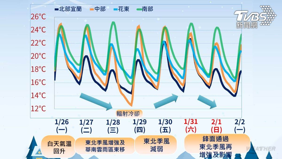 週三晚間到週四清晨,可能出現輻射冷卻作用,中北部、東北部都市低溫12至14度,空曠地區低溫10至12度或10度以下;南部、花東都市地區低溫14至16度,空曠地區12至14度,為本次冷空氣溫度最低的一段時間。