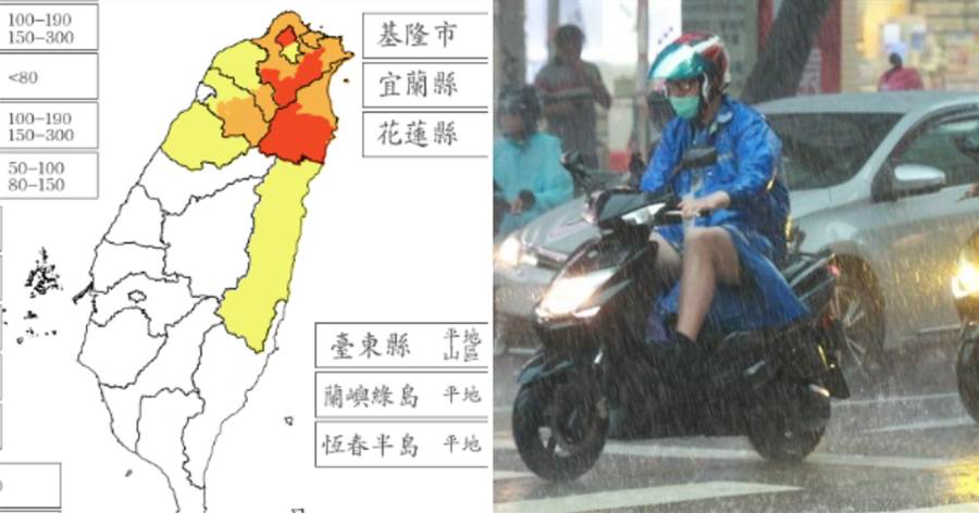 受到東北季風及低氣壓影響,氣象署針對基隆市、新北市、台北市、宜蘭縣發布大豪雨特報,而根據氣象署今(21)日10時發布的雨量預測顯示,共有5縣市明日雨量達停班停課標準。