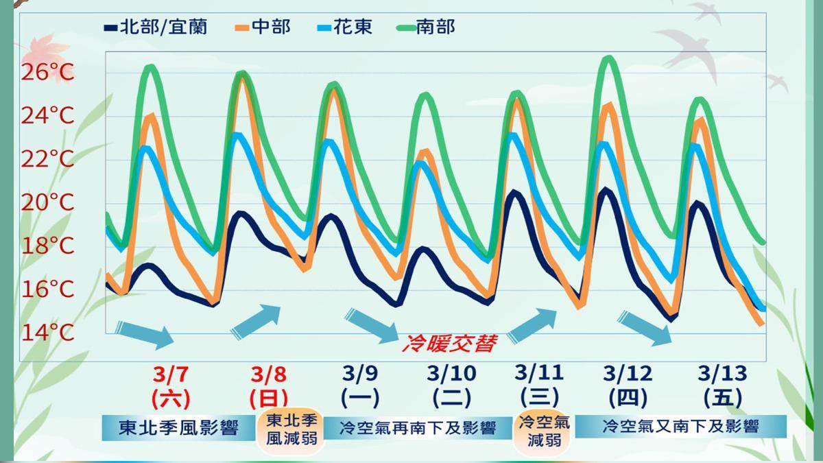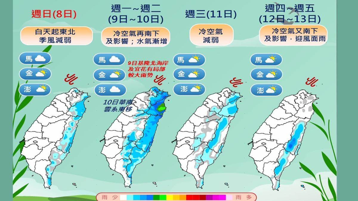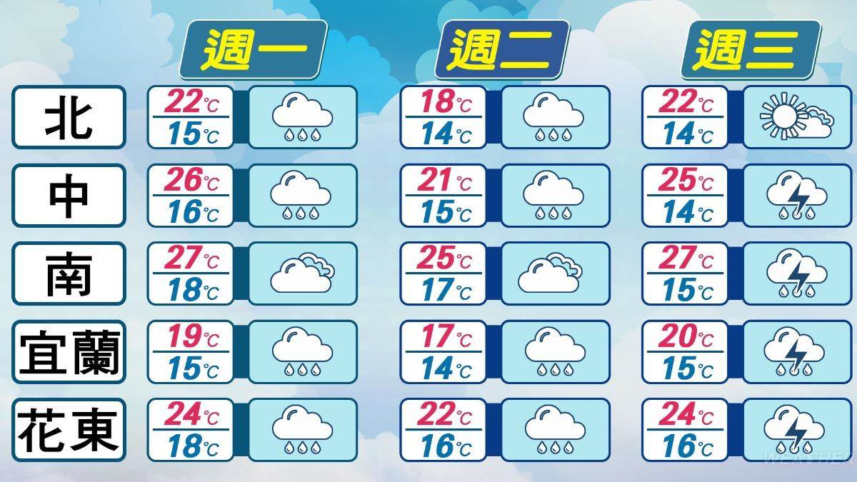 週二(10日)仍受大陸冷氣團影響,北部、東北部天氣偏冷,其餘地區注意「日夜溫差較大」,各地低溫約14至17度。此外,由于華南水氣透過,各地雲量增加,「中部以北」可能有短暫陣雨機會。到了週三(11日)冷氣團逐漸減弱,北部、東北部高溫19至21度;中南部、東南部約24至27度。不過清晨與夜晚仍偏涼,低溫約14至15度。