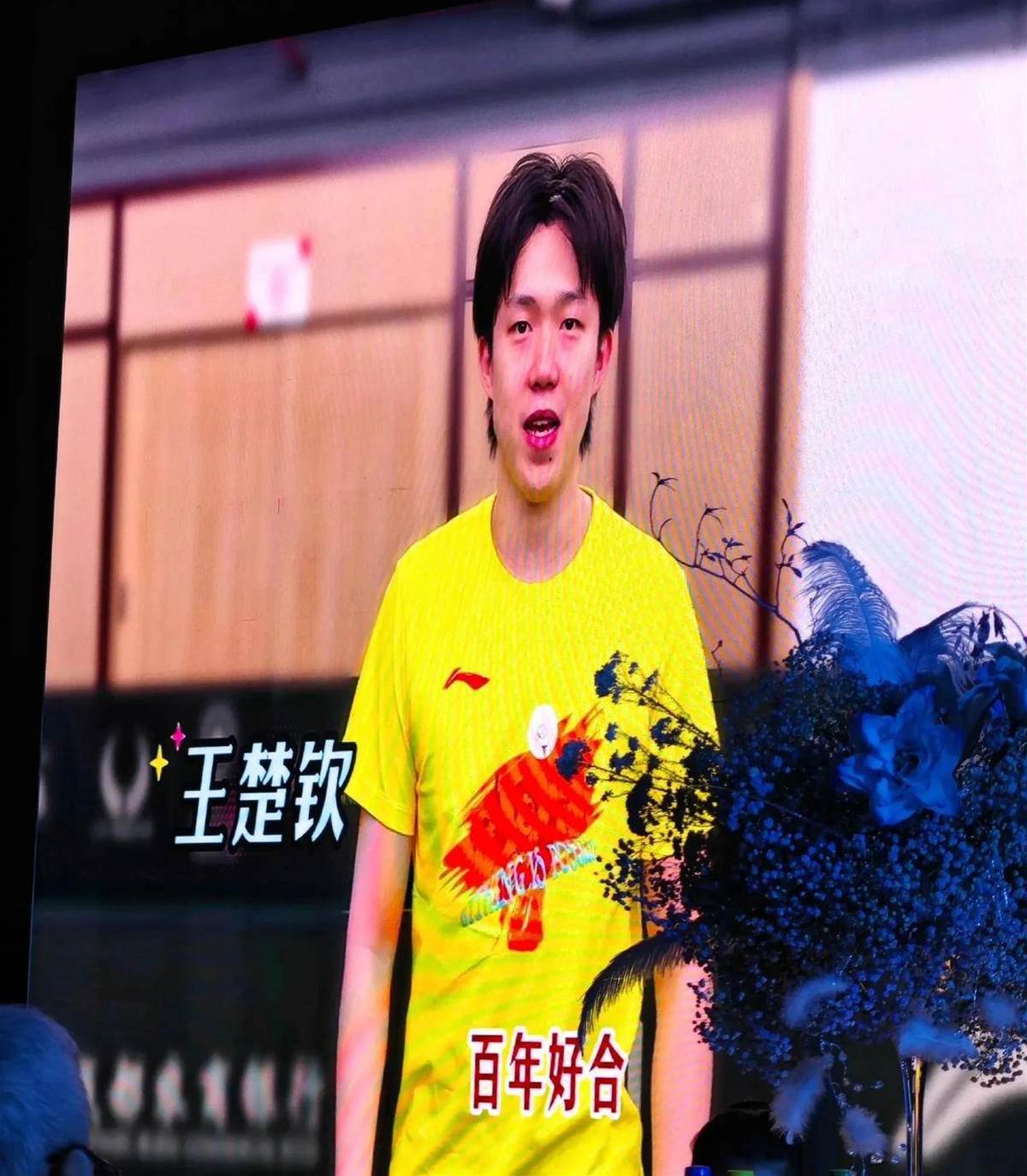 樊振東在視訊中說道:「今天是個大喜的日子,祝黃雅瓊與劉雨辰新婚快樂、百年好合。」汪順的祝福尤為幽默:「如果孩子練羽毛球太辛苦,學游泳也可以!」引發全場笑聲。