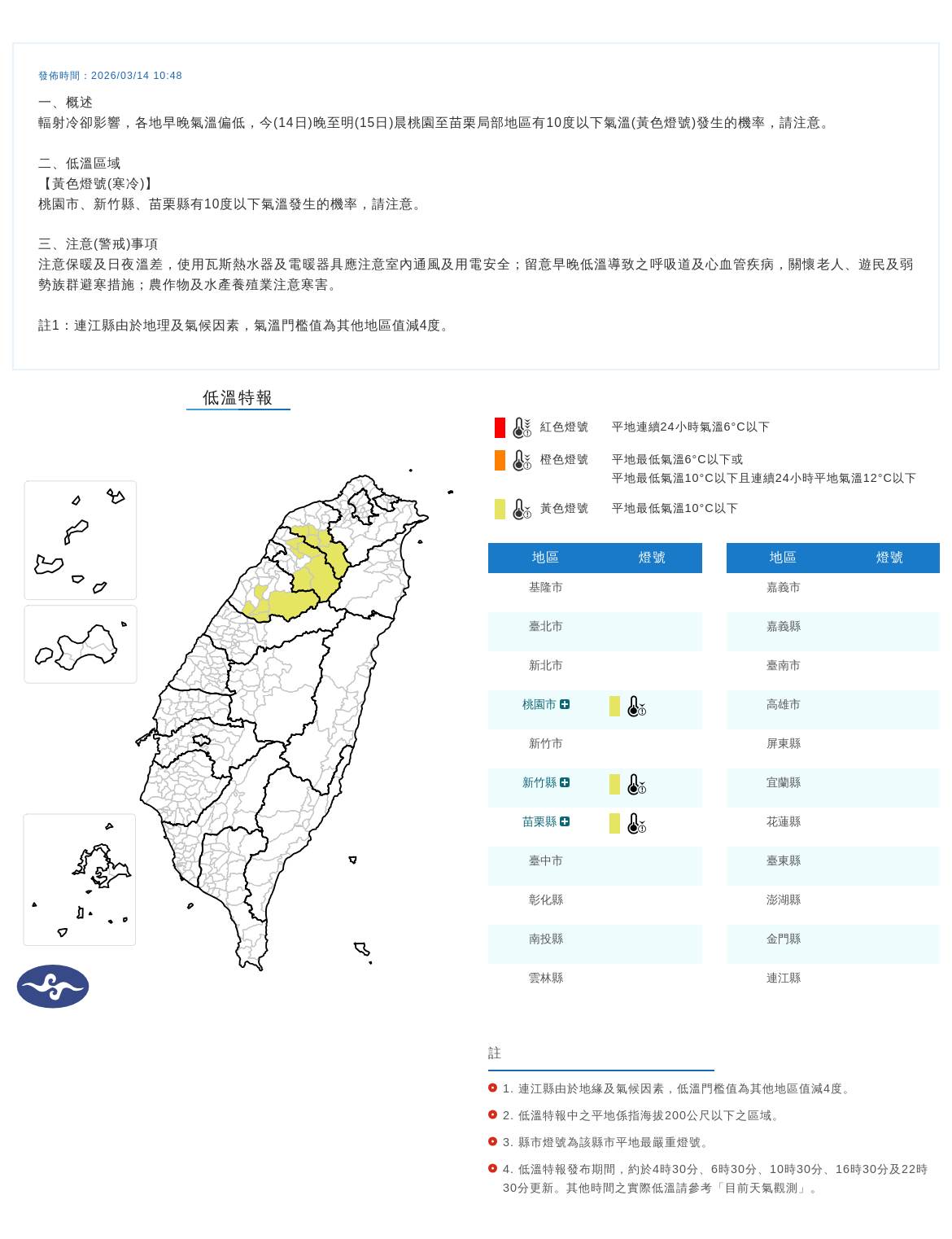 入夜後輻射冷卻效應將再度明顯,各地氣溫將顯著下降,區域性地區低溫僅12至14度,空曠處及沿海、近山區域更可能降至10度左右。氣象署提醒民眾,近日早晚溫差大,外出時應留意保暖。