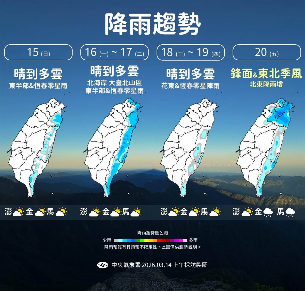 下週一(16日),迎風面的北部及東半部地區將呈現多雲有短暫陣雨的天氣型態,其他地區則為晴時多雲。氣溫方面,苗栗以北及宜花地區高溫約21至23度,中南部則有24至27度,各地日夜溫差仍大。
