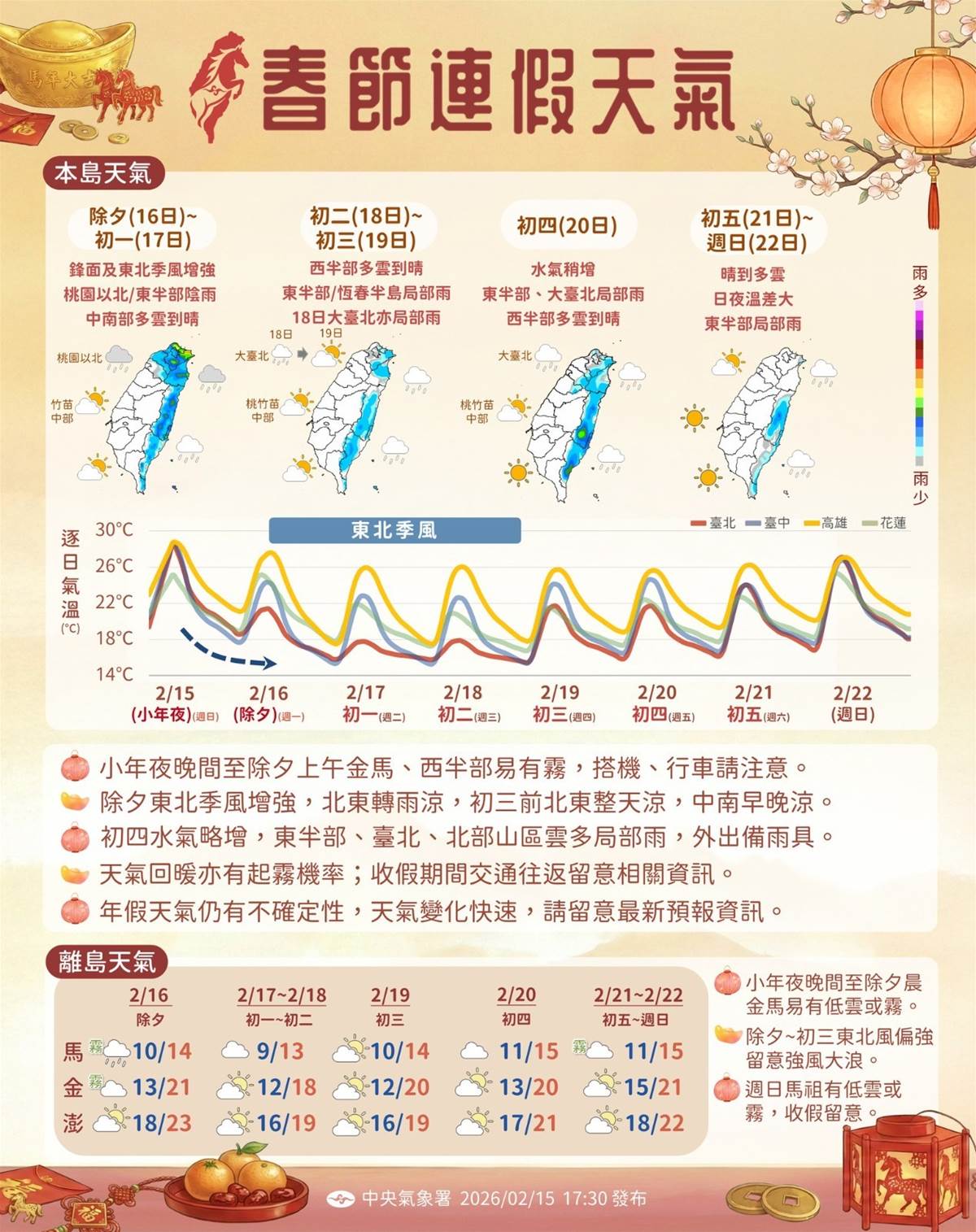 然而到了週五水氣將逐漸增多,降雨范圍將明顯擴大,週五初四開始,水氣明顯增加,基隆北海岸、大台北地區、東半部及恆春半島將出現局部短暫降雨,中部以北山區也會有零星短暫雨勢。週六初五至下周一期間,降雨主要集中在花東、恆春半島,會有局部短暫陣雨,宜蘭則是零星短暫陣雨。