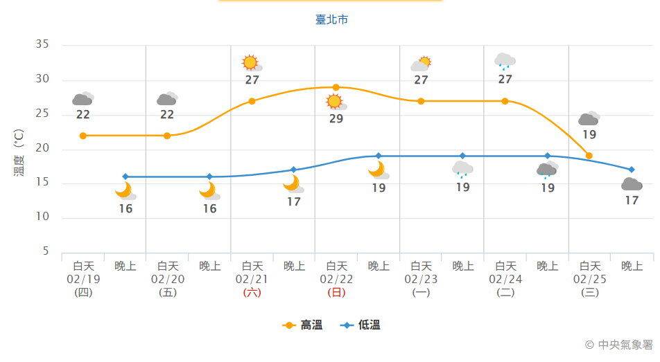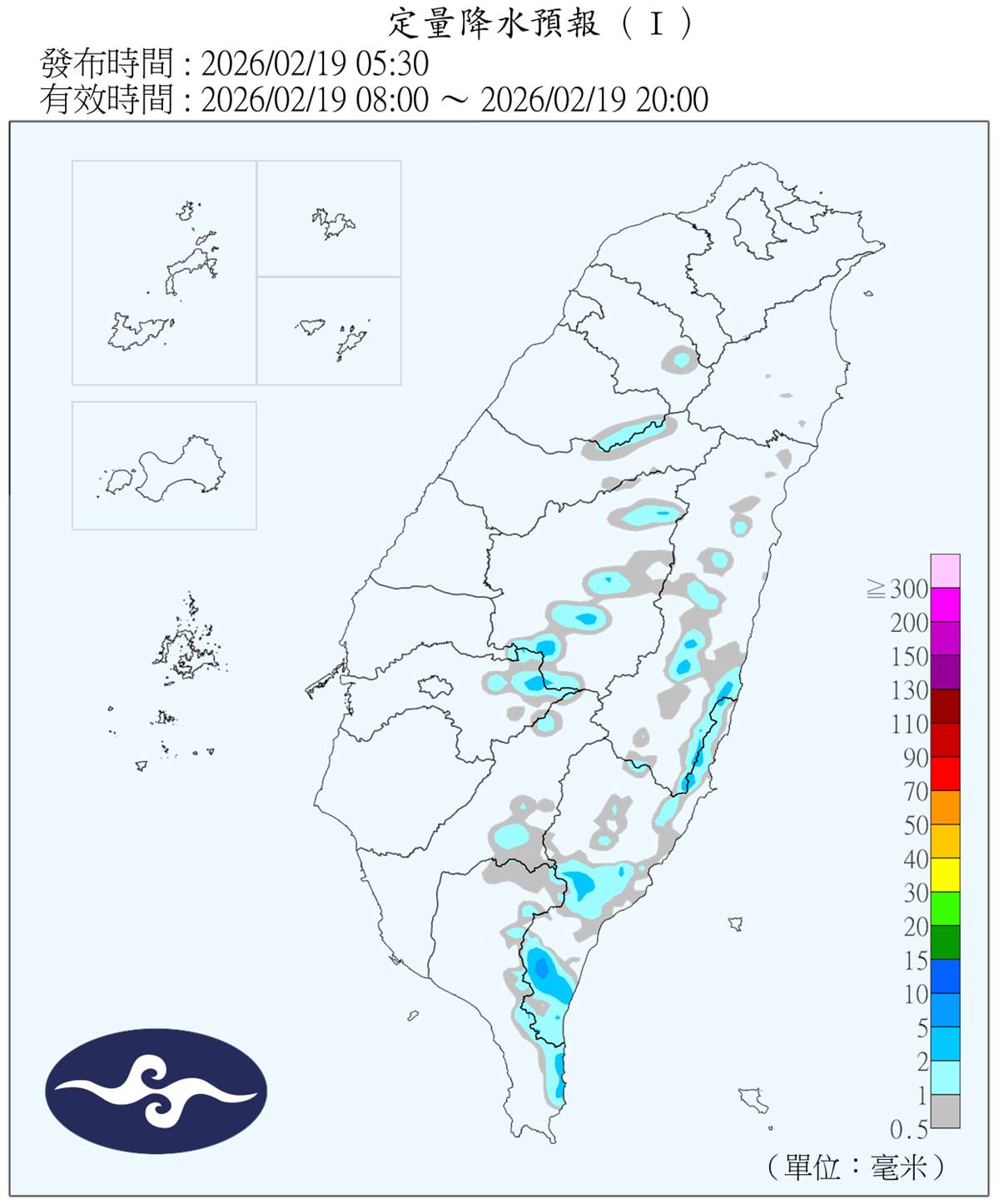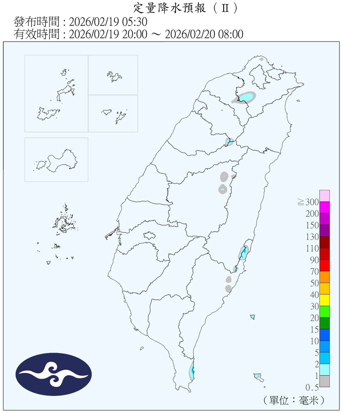 白天開始冷氣團勢力減弱,各地溫度將逐步回升,宜蘭及花蓮預計高溫約19至20度,台南以北及台東可達21至24度,高屏地區甚至來到24至26度。降雨部分,目前僅東半部及西半部山區會有零星短暫降雨。
