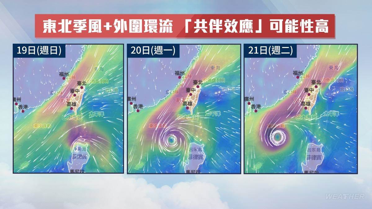迎風面的台灣北部、東北部及東部地區,會與環境的東北季風肇生共伴效應,造成額外且連續降雨,要特別注意防范。