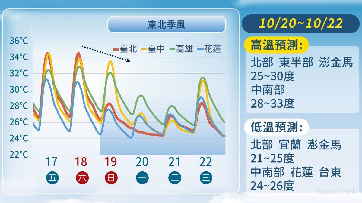 「本週後期變天,降溫、降雨均有感」,林得恩在臉書粉專「林老師氣象站」中表示,受大陸冷氣團影響,一股冷空氣正于中國華北地區悄然醞釀發展。未來數天將開始大舉南侵,預計週日(19日)前後就會抵達台灣北部外海,成為本年度首波「似樣又夠格」的東北季風個案。中部以北、基隆、宜蘭及外島的澎、金、馬等地區早晚最低氣溫有機會降至22至25度,南部和花東地區最低氣溫也在24至27度之間,驟降的幅度可達10度。這跟過去1個月以來,每日高溫動不動就來到35度或以上的狀況差異極大。