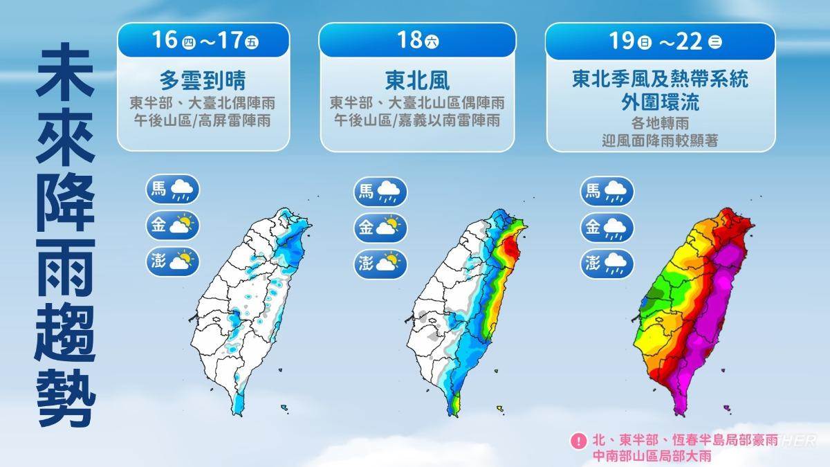 今天(16日)環境偏東風,基隆北海岸、大台北山區及宜蘭地區有不定時局部短暫陣雨,其他地區多雲到晴,高溫上看36度,晴朗炎熱的天氣維持到週六(18日)。風神颱風即將生成,與東北季風產生共伴效應,台灣大學大氣科學博士林得恩提醒,預估一口氣降溫10度,也會有明顯雨勢。